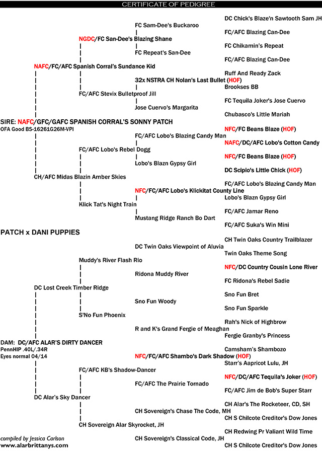 Breeder/Owner: Jessica Carlson Click here to view Sundae's pedigree Sundae was my pick puppy from a much anticipated breeding of our Dani to NAFC/GFC/GAFC Spanish Corral's Sonny Patch. Sundae is everything I hoped for from this breeding - beautiful, smart, full of personality, big running and independent in the field, stunning on point! She earned her Puppy points easily, but her Derby time was interrupted with an unplanned litter by Treasure States Toby Mac Daddy. Their 6 sons from this litter are now hunting and playing in 6 different states. Sundae got to show a couple of times in 2021 and earned her first show point, then got back to business in the field getting steady to wing and shot in preparation for adult stakes. She returned to the show ring in the summer of 2022 to complete her show title, and is continuing in the field working towards her Dual Championship. Her first "planned" litter, was sired by GFC/DC Almaden's Under Lock And Key in August 2023, and five of those six will be competing in field and show in the future. Unfortunately when they were weaned, Sundae ate a foreign object and got an extremely bad case of mastitis while at the vet, forcing her to have two surgeries and missing out on her fall trial season, but we have high hopes for her in 2024! Sundae's littermates include CH/AFC Alar's Patch of Blue Sky (FC pointed), CH Anchor's Lucky Number Seven (dual pointed), Dance The Dust Off JH (field & show pointed), and Reidyhill's Down And Dirty (adult field points), whose pictures can be seen at the bottom of Dani's page.